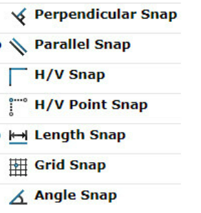 | 잘 사용하지 않음. H/V Snap : 수직 수평 스냅 H/V Point Snap : 점에서 수평 수직 스냅 Length Snap : 길이 스냅 Angle Snap : 각도 스냅 |