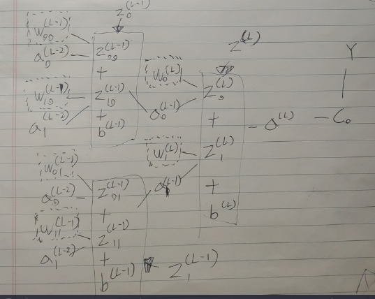 W(L-1)00의 경우 L-2 layer의 0번 노드에서 0번 노드로 이어지는 L-1 넘버의 가중치이다.